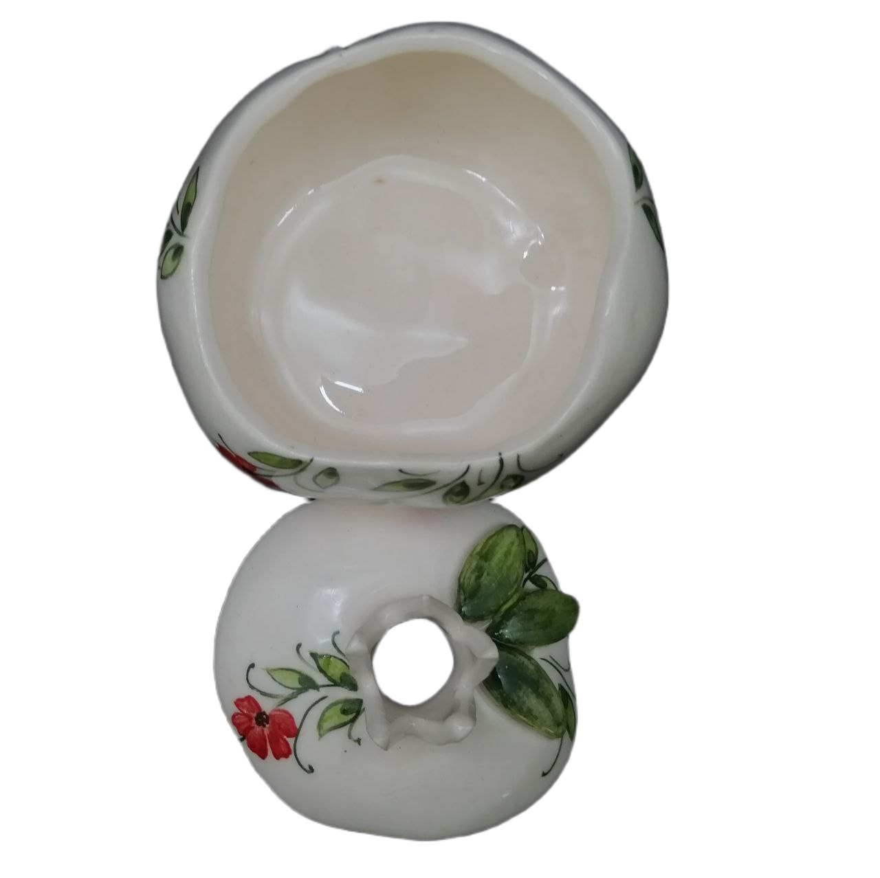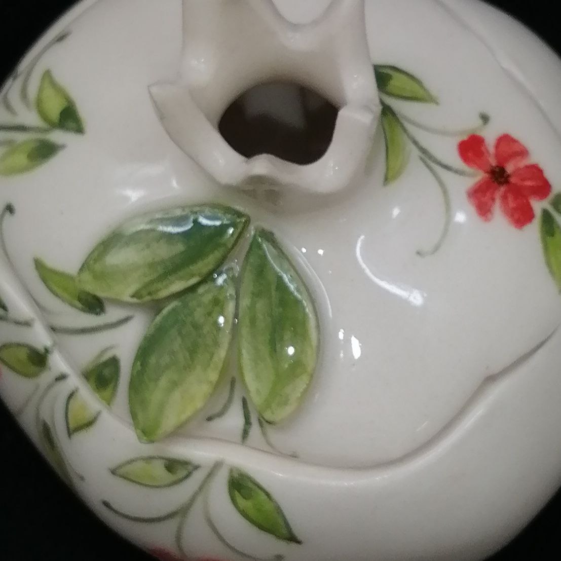 بانکه انار هیوا بههمراه درب آن بهصورت برجسته و کاملاً دستساز شکل گرفته است. هنرمند پس از ساخت بدنه و تبدیل آن به مرحله بیسکویت، نقوش گل پیچک را با قلممو روی سطح کار اجرا کرده و سپس بانکه را لعابکاری و پخت نهایی کرده است. این فرآیند، جلوهای زنده و هنری به اثر میبخشد.