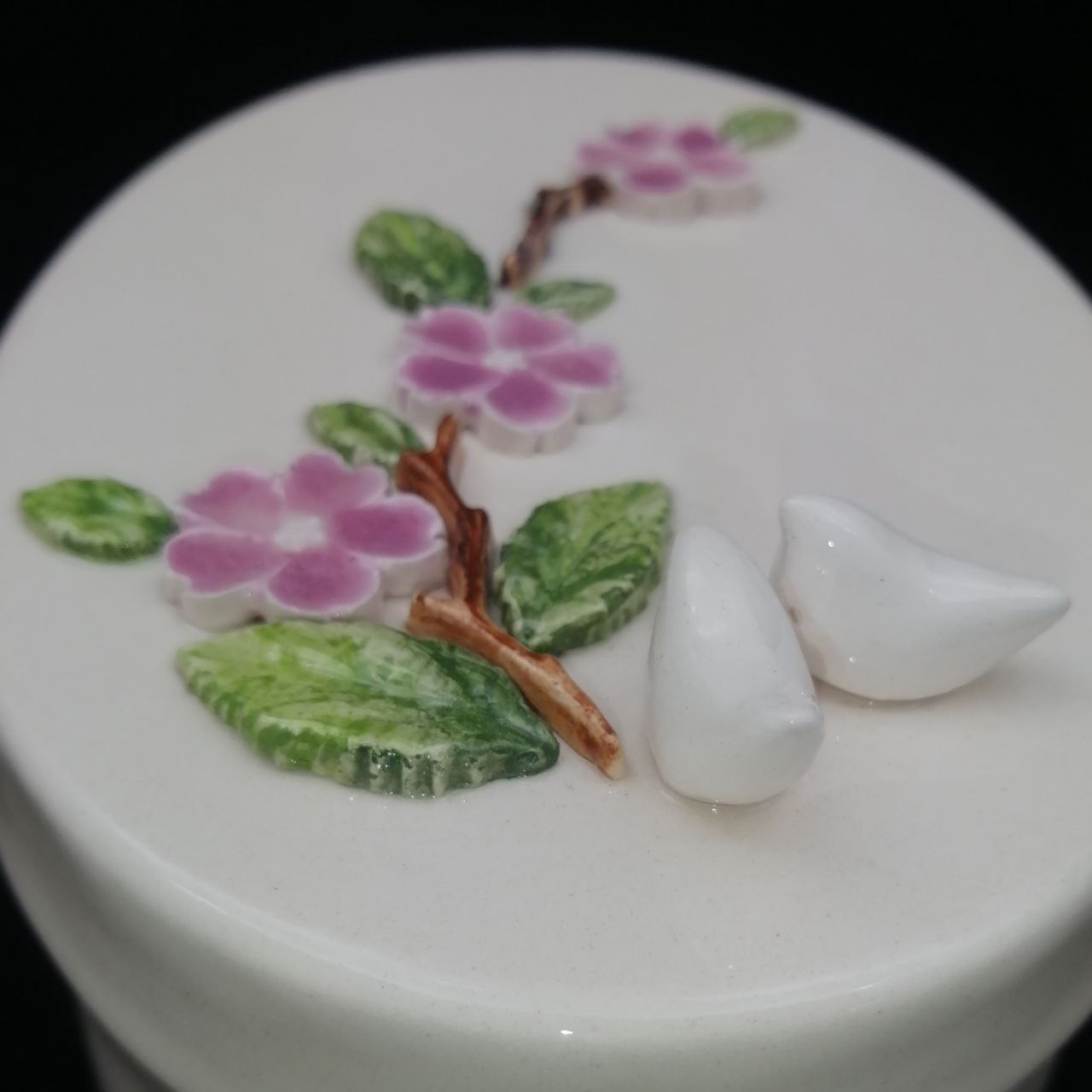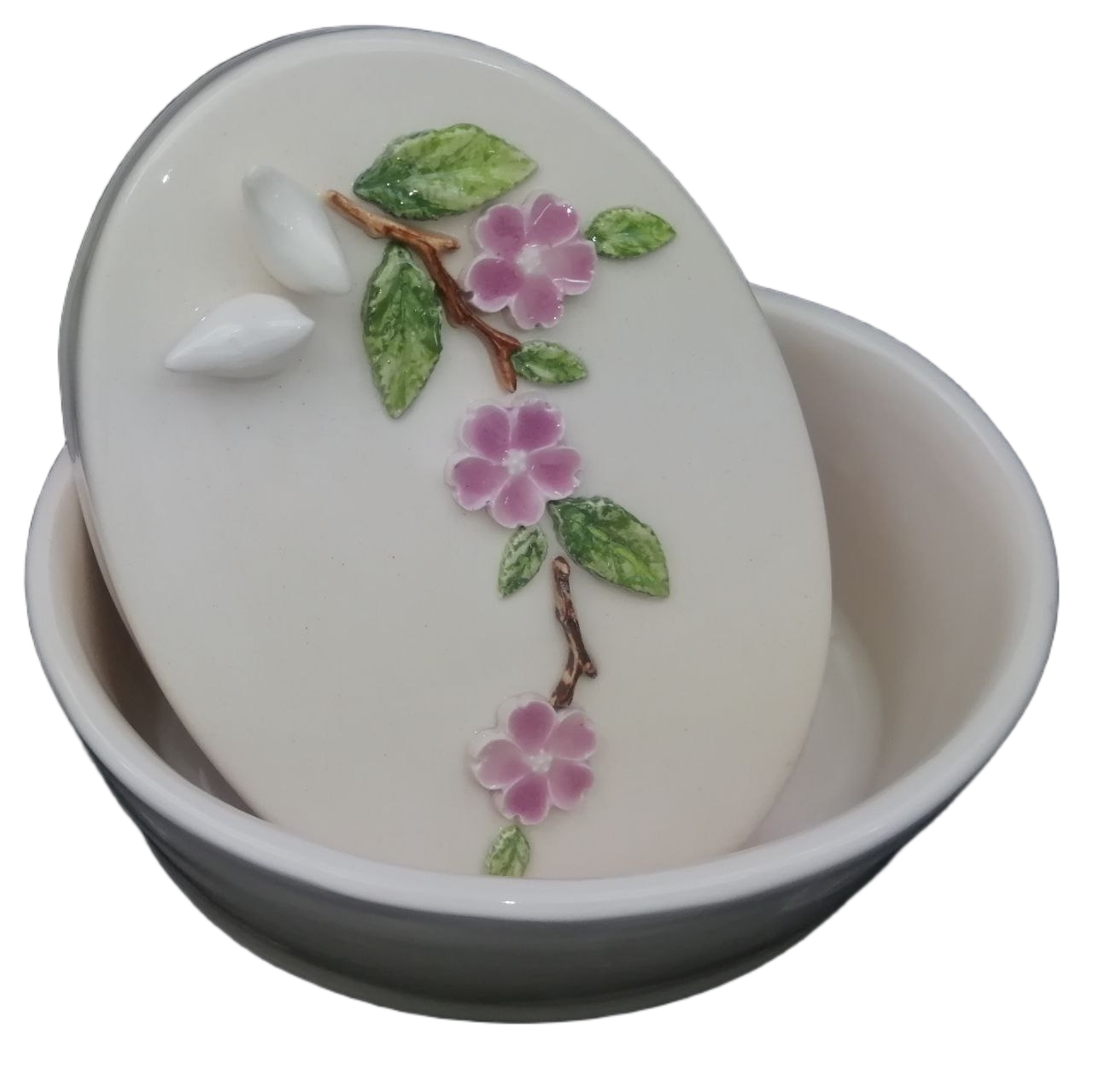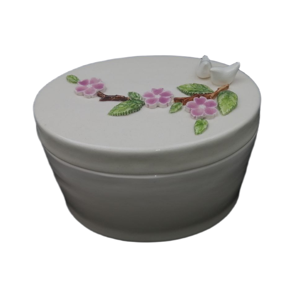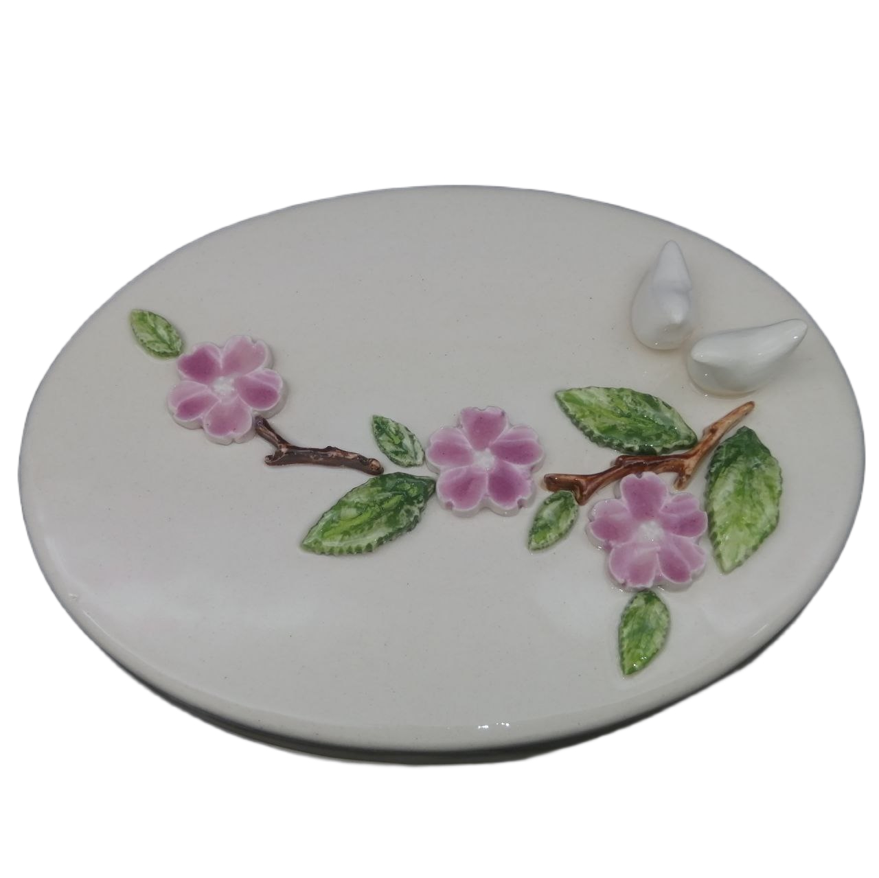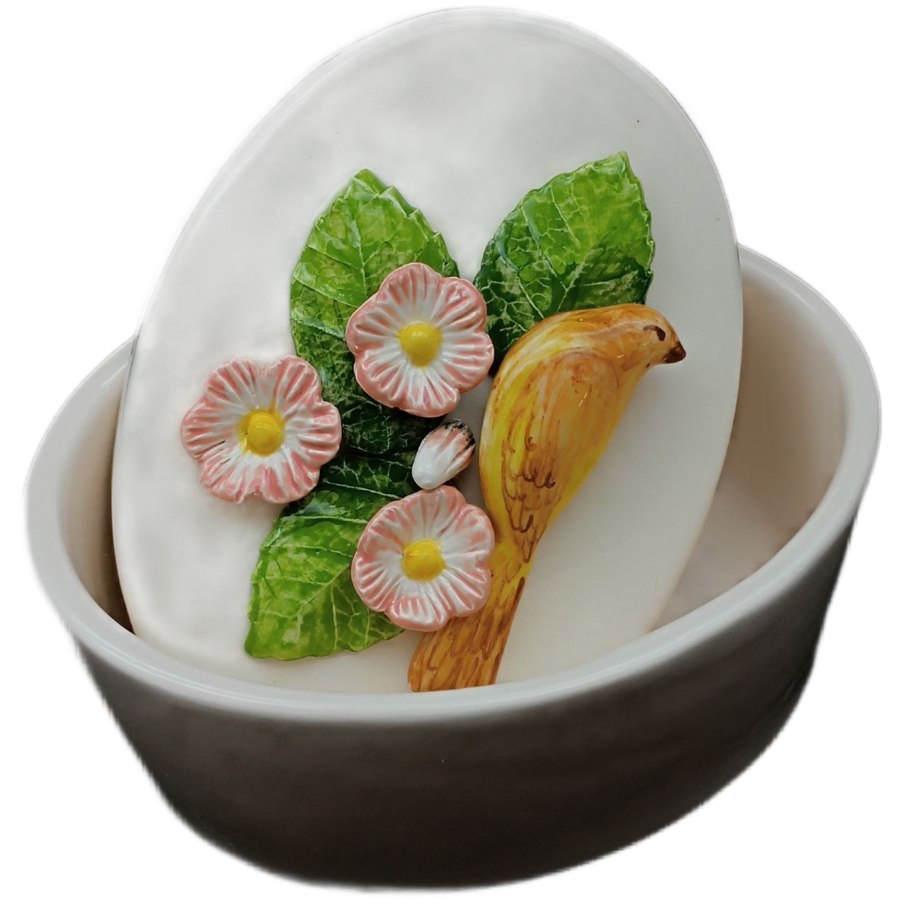 شکلات خوری دربدار ندا هیوا از اثار دستساز هیوا سرامیک ( سفال هیوا ) میباشد که با گل سرامیک ساخته و نقش روی آن برگرفته از طرح گل و مرغ سنتی پیچک معروف ایرانی و طرح برجسته و زیبا از طبیعت سبز میباشد.